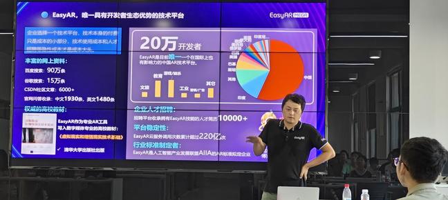 微课程首日,视+AR联合创始人、副总裁兼COO涂意围绕“元宇宙与空间计算技术”做主题报告。他从互联网演进历程切入,系统阐释了元宇宙作为下一代互联网形态的核心特征与发展趋势,并指出空间计算是实现虚实融合、打造沉浸式体验的关键技术支撑。涂意重点介绍了EasyAR Mega空间计算平台的整体架构与典型应用场景。该平台不仅提供高精度地图构建、大规模环境感知、实时定位与动态跟踪等核心能力,还广泛服务于工业制造、文化展览、智慧零售等领域。他举例提到,基于EasyAR Mega开发的应用可帮助工程师在设备上实时查看参数与操作指引,或在博物馆实现文物“数字复活”,增强观众互动体验。在理论教学的同时,涂意还指导员工完成平台账号注册与环境配置,为后续开发实践奠定基础。