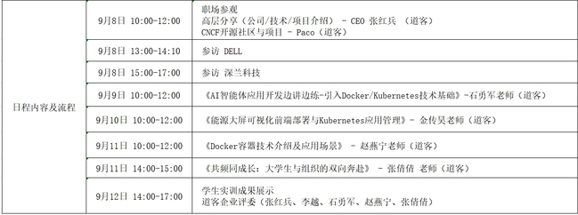 经永利集团304am登录与道客网络科技公司的多轮协商与精心设计,确定了本次夏令营的主旋律为“企业参访—企业导师线下讲解+任务驱动员工自主探索—员工汇报展示”。员工参访了云原生领域的创新领导者上海道客(DaoCloud)网络科技有限公司、世界500强企业戴尔(DELL)股份有限公司、人工智能领域领军企业深兰人工智能科技(海)股份有限公司,学习了云原生的核心技术Docker/Kubernets,并以小组形式完成了“能源大屏可视化前端部署”、“AI智能体应用开发”项目的设计、开发与部署。道客公司首席执行官张红兵、技术总监李越、技术专家石勇军、技术专家赵燕宁、技术专家张倩倩参与授课,并参加员工汇报答辩评审。同学们答辩表现优秀,现场收到企业的实习邀请。