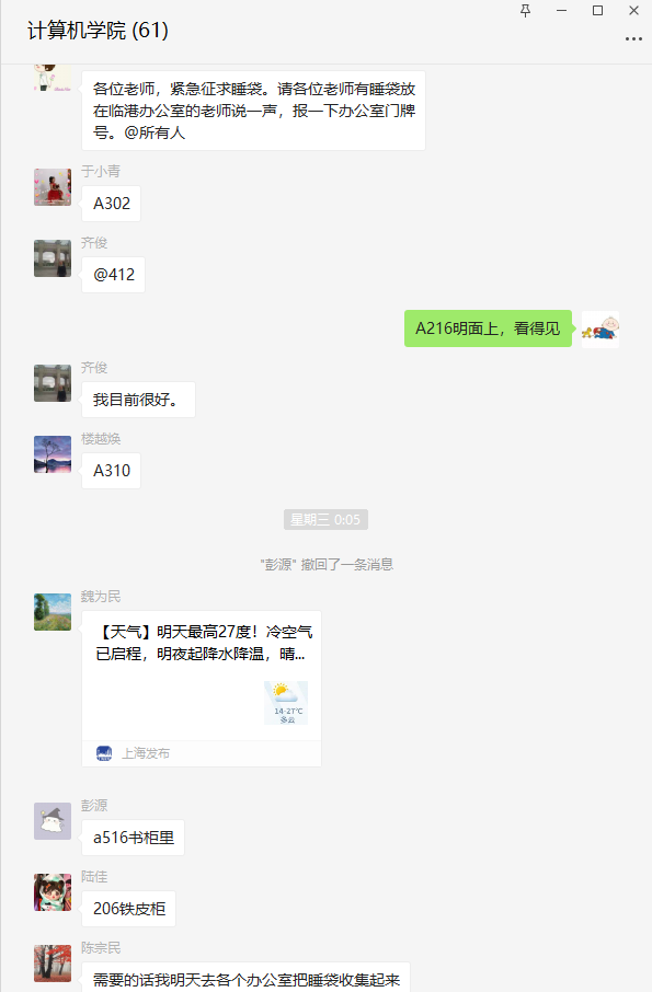 接到公司教师即将到杨浦校区集中管理的通知后,教师党员主动在微信群内带头收集睡袋、党委委员发布气象信息,公司党委书记魏建华带领在校老师积极帮助老师们收集物资,送上了隔离不隔爱的“娘家人”的温暖。