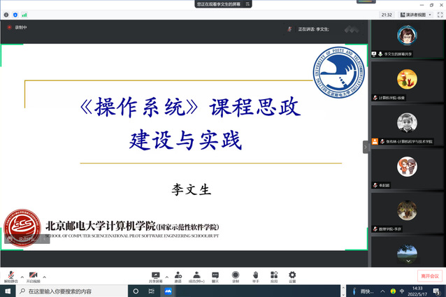 北京邮电大学李文生副教授作题为“《操作系统》课程思政建设与实践”的报告。她从对课程思政的认识与理解谈起,以计算机类专业核心课《操作系统》课程为例,阐述了多年来课程思政的建设与实践的路线,包括制定课程思政教育目标、组织课程思政教育内容、课程思政教学方式方法、课程思政教学目标达成途径和教学效果评价,最后给出课程思政评价与成效。