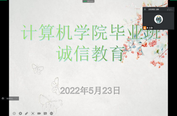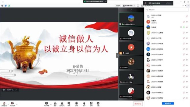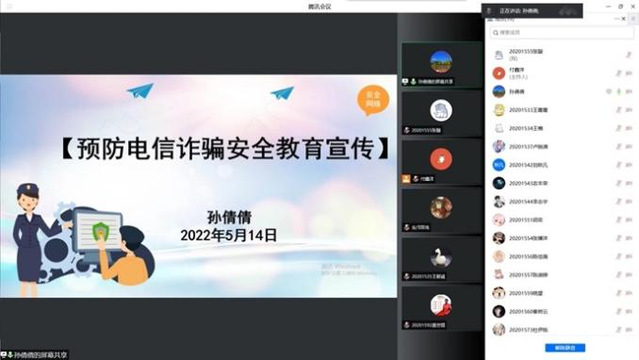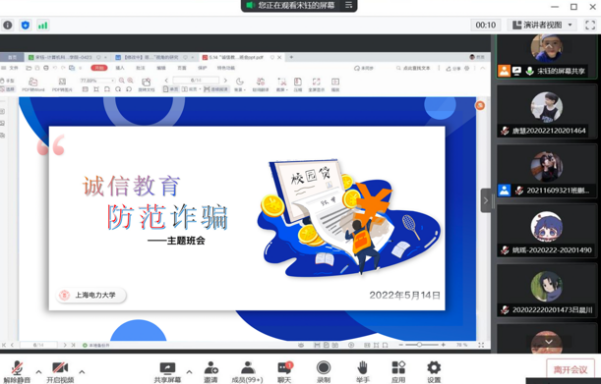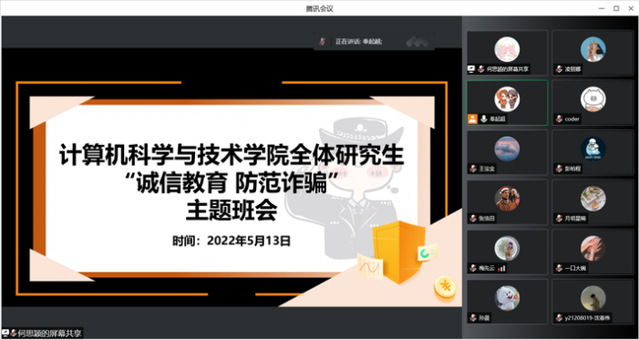 为进一步落实公司资助诚信教育工作要求,提高员工诚信意识和风险意识,切实推进平安校园建设,近日,计算机科学与技术公司以线上会议的形式在本科生、研究生中开展多场“诚信教育防范诈骗”主题班会。