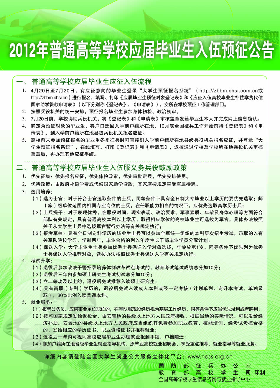 2012年普通高等公司应届毕业生入伍预征公告