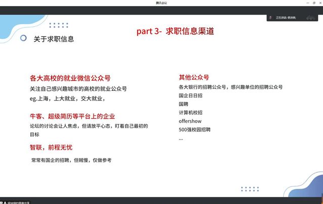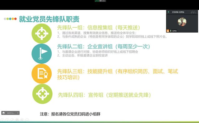 任祥宝老师对公司党员先锋队的职责做了详细介绍。就业党员先锋队分为就业信息搜集、企业进校宣讲、职业技能提升和宣传四个小组,包括帮助就业困难员工提升就业能力,搜集招聘信息,组织企业宣讲和宣传等职责。侯诗琪同学作为上一届就业党员先锋队负责人,从就业方向的划分、地域上的选择、单位的选择以及就业信息渠道的获取等方面分享了其求职和工作经验,让大家收益匪浅。