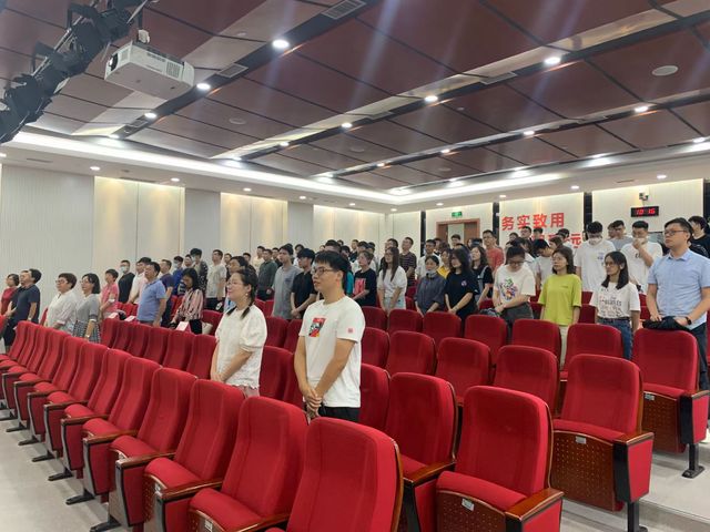 上半场开学典礼以全体师生起立奏唱国歌拉开帷幕。副经理李晋国代表广大师生对新生的到来表示热烈欢迎。经理温蜜向新同学提出三点要求,她希望研究生们能够大胆尝试、独立思考,培养坚毅执着敢于奋斗的优良品质,鼓励研究生们走出舒适区,吸收多元的知识,建立丰富的思维体系。副经理李晋国详细介绍了研究生教学科研情况,希望每位同学可以规划好时间;导师代表张凯提出做学问前先做人,培养良好的道德品质,志存高远,脚踏实地。老生代表靳文星建议新生能充分利用资源,了解学科的科研动态,多参加各类竞赛,丰富自己的研究生生活;新生代表何思颖分享了自己的本科经历和感悟,也针对研究生的生涯规划问题,向大家分享了自己的思考。随后党委书记魏建华希望研究生们能做到爱校爱党爱国,真人真心真诚,树立正确的人生观、价值观、世界观,养成尊师重道的良好品德,明辨是非,认真学习,提高自己的科研科创能力。最后党委副书记余南飞希望同学们学会尊重,学会适应,明确规则,科学规划,树立坚定的理想信念。